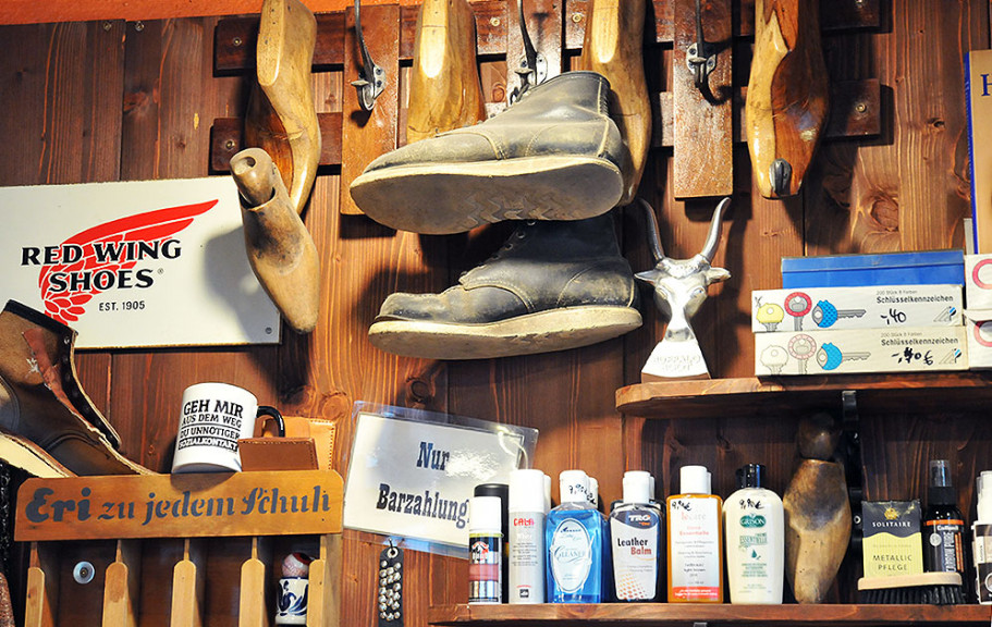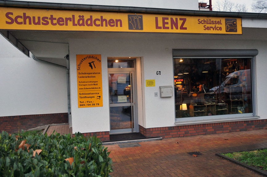 Werte erhalten durch Reparieren und Pflegen. Schuhe reparieren lohnt sich! Klein aber fein. Im Herzen von Frankfurt Preungesheim, in der Homburger Landstraße 67. Hier ist der Sitz des Familienunternehmens Schusterlädchens Lenz. Unsere Philosophie: Kunden, die mit Problemen zu uns kommen, werden schnell, fachgerecht und persönlich bedient. Gleich ob offene Nähte, Löcher im Fersenfutter, abgebrochene Absätze, durchgelaufene Schuhsohlen, ausgerissene Ösen und zu enge oder zu weite Schuhe. Auch komplizierte Schuhreparaturen sind für uns kein Problem von Alden, Buffalo, Dinkelacker, Lloyd, Lowa, Meindl, Red Wing bis zu diversen Sportschuhen. Das Handwerk und Spaß an der Arbeit wird bei uns großgeschrieben. Schauen Sie sich z.B. einmal unsere Lederarbeiten an. Dann wissen Sie warum!  Und sollte wirklich einmal die Haustüre hinter Ihnen zufallen. Rechnen Sie mit uns, wir helfen kompetent, schnell und zu fairen Preisen!